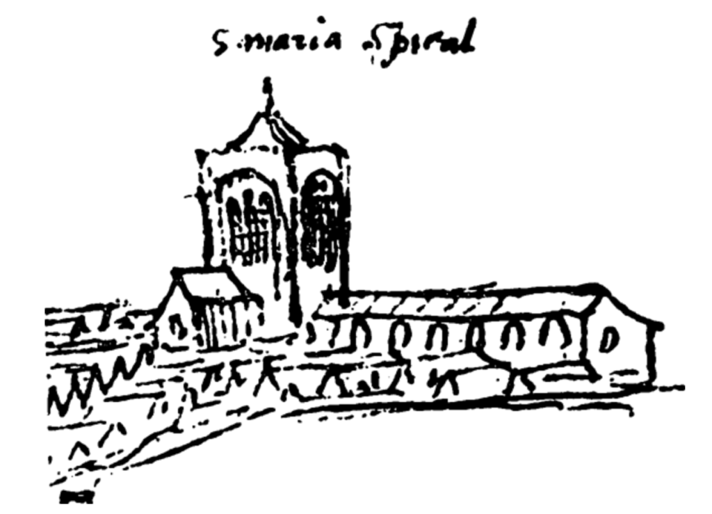 An excellent example of this survives here in London’s Spitalfields. The name “Spitalfields” actually is a clue about what was going down there. It is not, in fact, a reference to spit, but a contraction from “Hospital Fields”. More specifically the name is a reference to the hospital that was at the Priory of Blessed Mary without Bishopsgate. St Mary Spital, as it was more commonly called, was an Augustinian house set up by a bunch of rich people in the twelfth century (which was very much the style at the time). By the fourteenth century the Augustinians had a nice little hospital going, which we also know because of records that some of servants from rich houses would be sent there for treatment as and when they were unlucky enough to fall ill with, well, whatever.