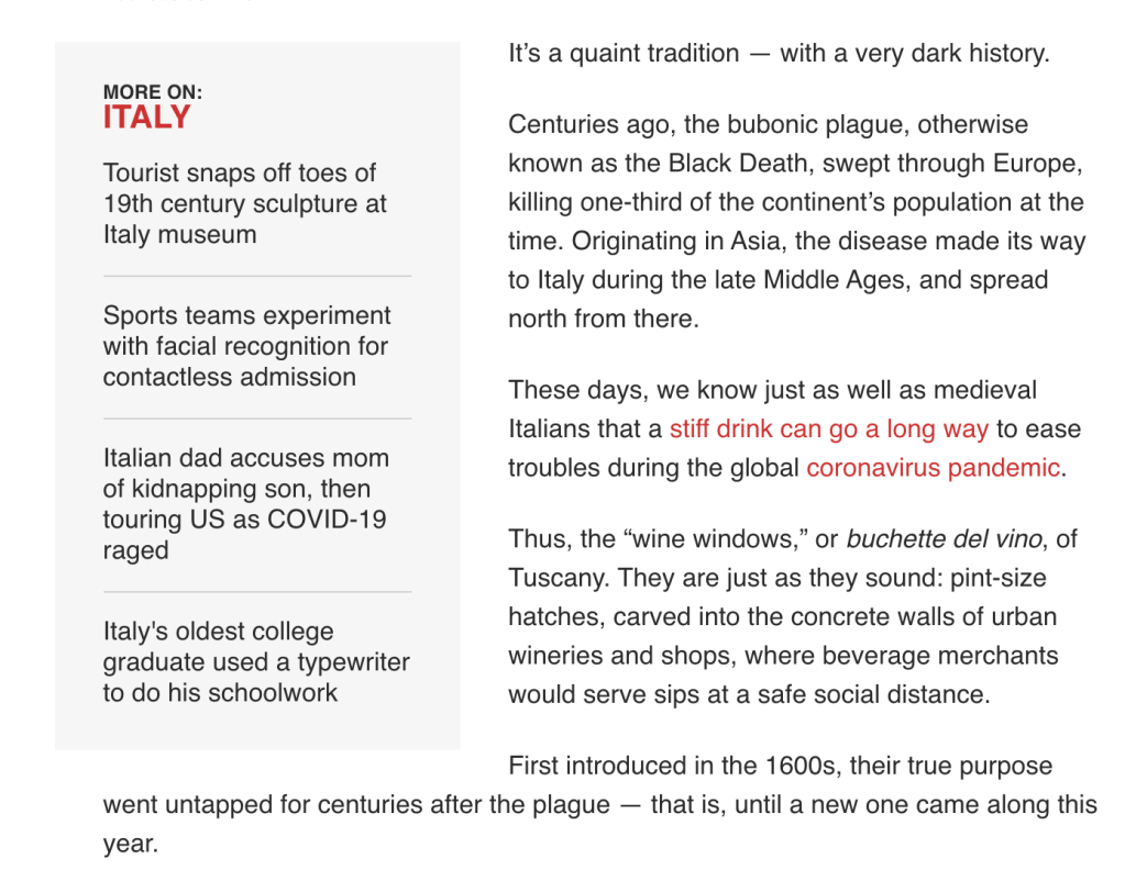 The reason why the designation of the seventeenth century as medieval winds me up, weapons-grade pedantry aside, is that the same people who go around announcing that the seventeenth century plague is a medieval phenomenon are also the first to start wanking about how the Renaissance took us all out of the terrible torpor of the Dark Ages or some such nonsense. For those keeping track, the Italian Renaissance is generally talked about as lasting from the fifteenth to the sixteenth centuries. So, which is it? Is the Renaissance a real thing that definitively changed all of Europe and issued in an age of reason, (Spoiler: absolutely fucking not.), or were there medieval wine windows in the sixteenth century Italian lands? Pick one.