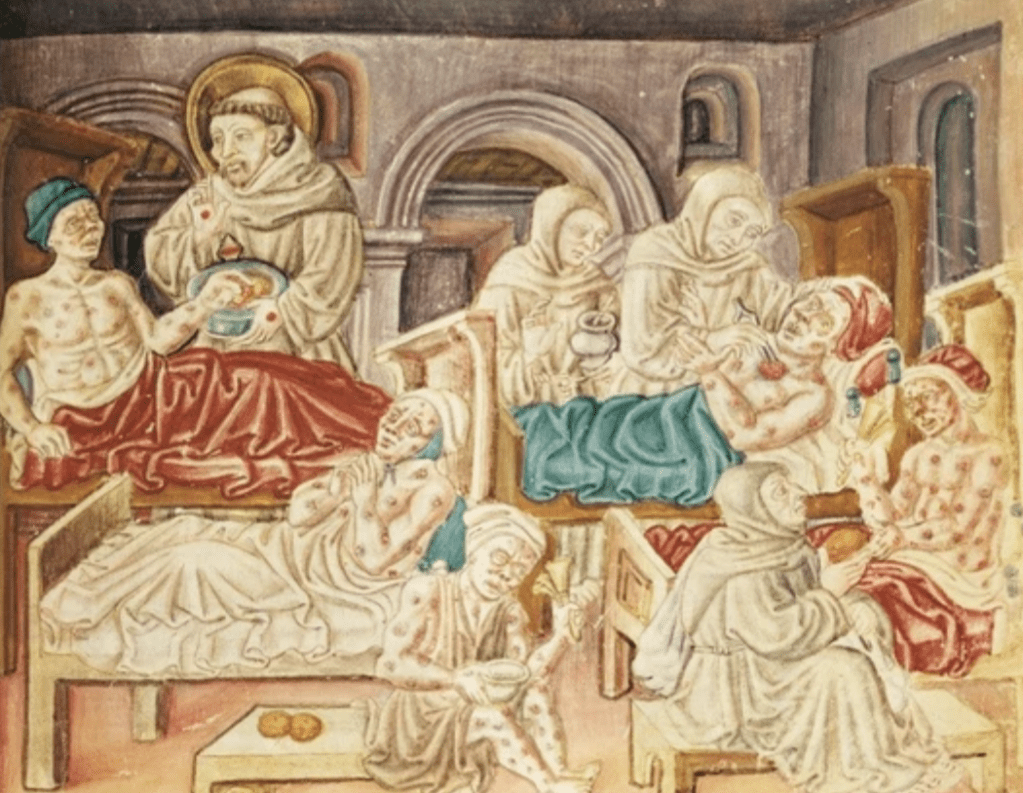 Instead, medieval Europeans were, you know, people who were actually in many ways more connected to and worried about their communities that we are. Medieval Europeans, as we have discussed before, used to offer free health care to sick people at hospitals run by monks and nuns. They all did a valiant job attempting to keep people with the plague alive, or at least alleviate their suffering.