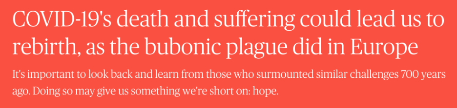 Leaving the idea that intellectual movements solve everything aside, there is also the small fact of the matter that the Enlightenment takes place a full 250 years after the Renaissance. That is almost twice as much elapsed time than from the Black Death to the Renaissance. That is 369 years after the Black Death broke out in Europe. What are we supposed to do, just fast forward through that part? If you want to convince me that the Enlightenment was actually a really great time for everyone and something similar is going to happen after COVID, you need to explain why I should be hyped for a silver lining in 2389. How does that benefit those of us being told to risk our lives and get back to work to save the economy with little to no protection? How is that supposed to make the millions of people at risk of being made homeless imminently feel better? What do you think this has to teach us now?