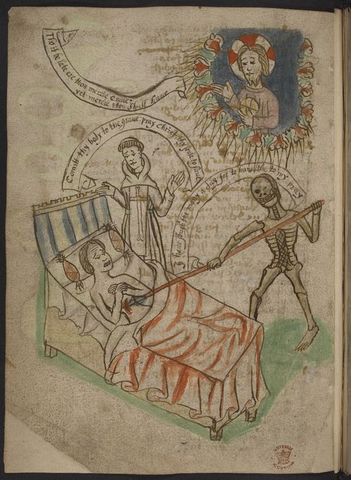 A man on his death bed, like a total girl. British Library, MS Additional 37049, f. 38v