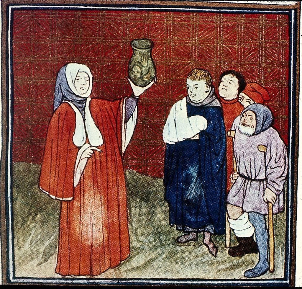 A physician, holding a urine flask, and hanging out with patients instead of in a university, Bibliotheque nationale France, MS 22, 534.